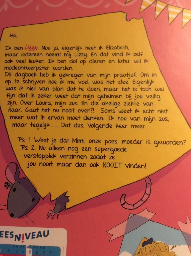 Dit dagboek heb ik van mijn praatjuf. Om in op te schrijven hoe ik mij voel. Eigenlijk was ik dat niet van plan, maar het is toch wel fijn dat ik zeker weet dat mijn geheimen bij jou veilig zijn. Over mijn zus Laura en die akelige ziekte van haar. Gaat het nu nooit over!?